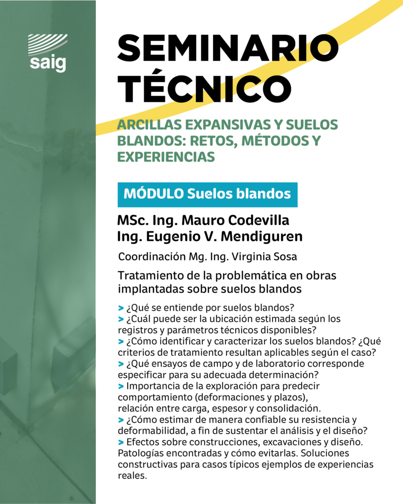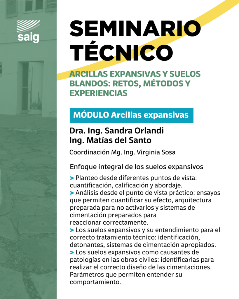 Desde SAIG les invitamos a participar del Seminario Técnico: “Arcillas expansivas y suelos blandos: retos, métodos y experiencias”, un encuentro presencial orientado al análisis de los principales desafíos que presentan estos suelos, junto con metodologías de estudio y experiencias prácticas aplicadas.
