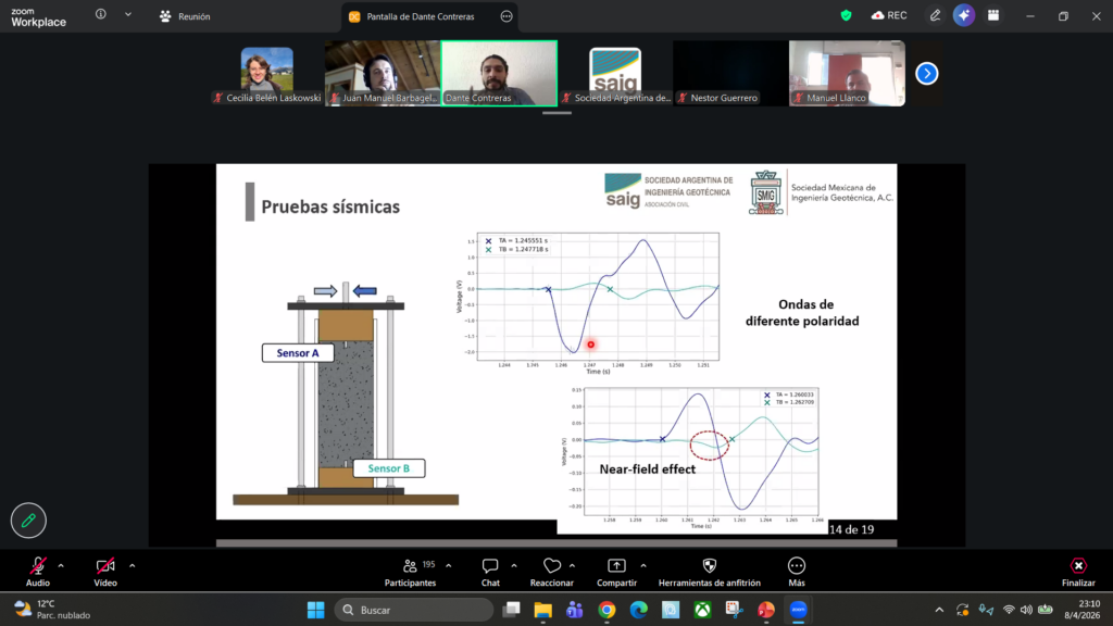 El día 8 de abril, se llevó a cabo de forma virtual la Primera Jornada Técnica de Jóvenes Geotécnicos 2026, organizada por Cecilia Belen Laskowski Orlandi, la Representante Internacional de Jóvenes Geotécnicos de Argentina. Esta actividad se realiza por segundo año consecutivo y está ganando gran importancia a nivel Latinoamérica. La temática abordada en la jornada fue la Geotecnia Sísmica Aplicada. El Grupo de Jóvenes Geotécnicos de Argentina con esta cuarta edición de la actividad pretendía seguir generando un ambiente en el que los jóvenes miembros de la Asociación Civil de Ingeniería Geotécnica de Argentina pudieran interactuar, compartir sus experiencias en la temática, discutir ideas y aprender. Adicionalmente, se busca entablar relaciones duraderas con los grupos dedicados a la geotecnia de países vecinos, pudiendo entablar discusiones enriquecedoras respecto a las diferentes experiencias en cada país. De esta manera, con la ayuda de Eliza Ríos, la encargada del Capítulo Estudiantil de la Sociedad Mexicana de Ingeniería Geotécnica, se invitó a Juan Manuel Barbagelata (Sociedad Argentina de Ingeniería Geotécnica SAIG Asociación Civil), Dante Uriel Contreras Ferreyra (Sociedad Mexicana de Ingeniería Geotécnica) y Ricardo Daniel Caballero (Sociedad Argentina de Ingeniería Geotécnica SAIG Asociación Civil), quiénes participaron liderando dos charlas “Introducción a la ingeniería geotécnica sísmica basada en desempeño y su aplicación a presas de materiales sueltos” y “Medición de la velocidad de ondas sísmicas en suelos parcialmente saturados con instrumentación de bajo costo” y una ronda de preguntas y discusión relacionadas a la temática mencionada. Esta primera actividad gratuita del año tuvo una alta participación tanto de jóvenes miembros como del resto de asociados de SAIG y de agrupaciones de países vecinos, sumando un total de más de 900 inscriptos y 200 participantes.