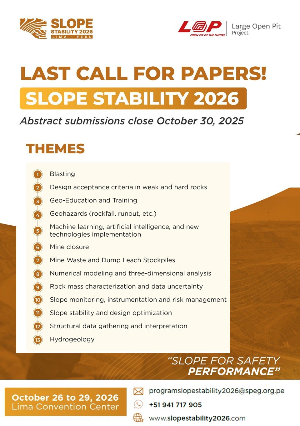 Compartimos el Slope Stability 2026, un evento clave para la ingeniería geotécnica e hidrogeológica, que reúne a los principales expertos, investigadores y profesionales de todo el mundo para compartir conocimientos sobre el análisis, el diseño y la mitigación de riesgos de taludes en la minería. La convocatoria para el envío de resúmenes técnicos finaliza el 30 de octubre de 2025.