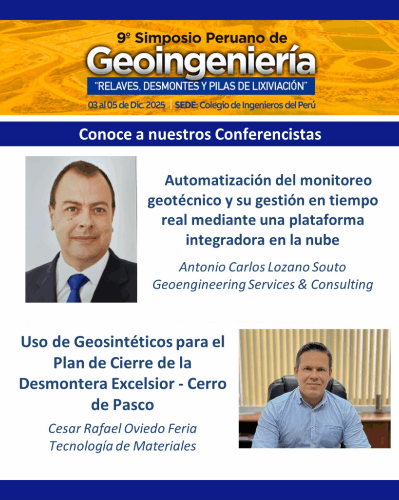 Presentamos las conferencias «Automatización del monitoreo geotécnico y su gestión en tiempo real mediante una plataforma integradora en la nube« del Ing. Antonio Carlos Lozano Souto y «Uso de Geosintéticos para el Plan de Cierre de la Desmontera Excelsior – Cerro de Pasco» del Ing. Cesar Rafael Oviedo Feria.