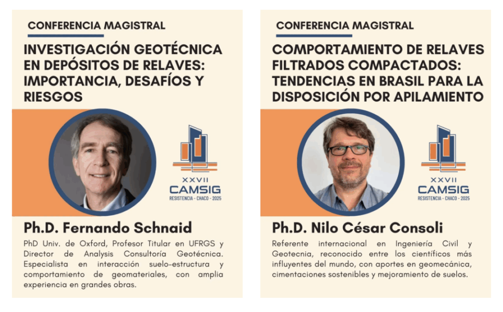 Nos complace anunciar las Conferencias Magistrales del Prof. Ph.D. Fernando Schnaid «Investigación geotécnica en depósitos de relaves: importancia, desafíos y riesgos» y del Prof. Ph.D. Nilo Consoli «Comportamiento de relaves filtrados compactados: tendencias en brasil para la disposición por apilamiento» en el marco del XXVII CAMSIG – Congreso Argentino de Mecánica de Suelos e Ingeniería Geotécnica.