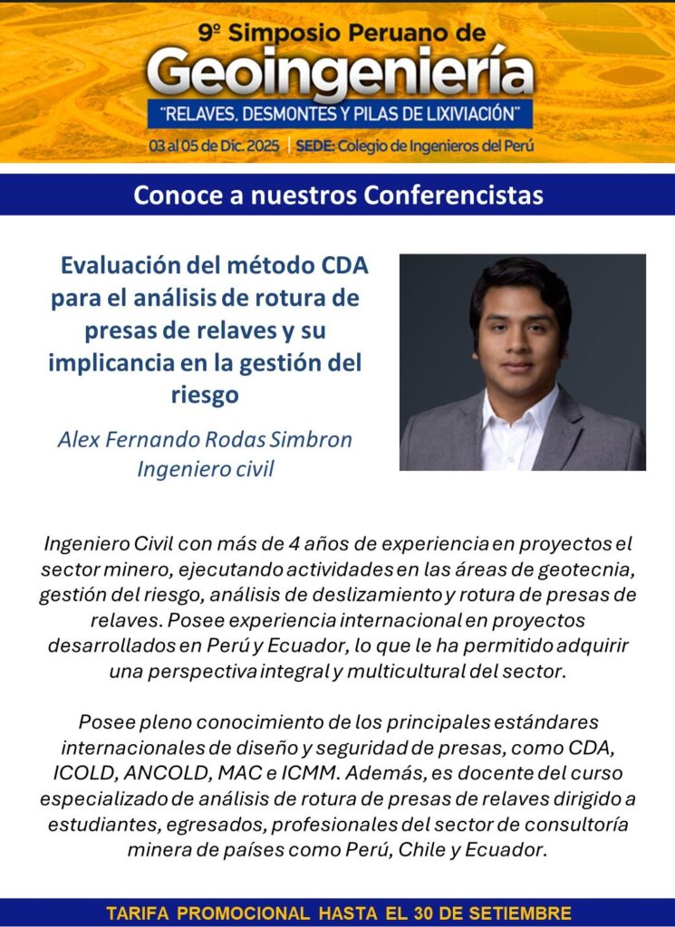 Presentamos la conferencia «Evaluación del método CDA para el análisis de rotura de presas de relaves y su implicancia en la gestión del riesgo» del Ing. Alex Fernando Rodas Simbron.